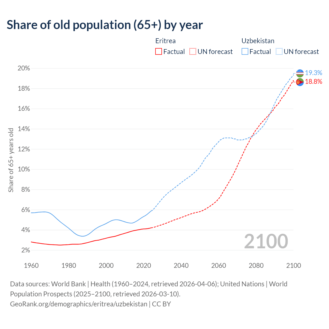 The share of older people aged 65 and over is 4.2% in Eritrea and 5.86% in Uzbekistan. Life expectancy in Eritrea compared to Uzbekistan .