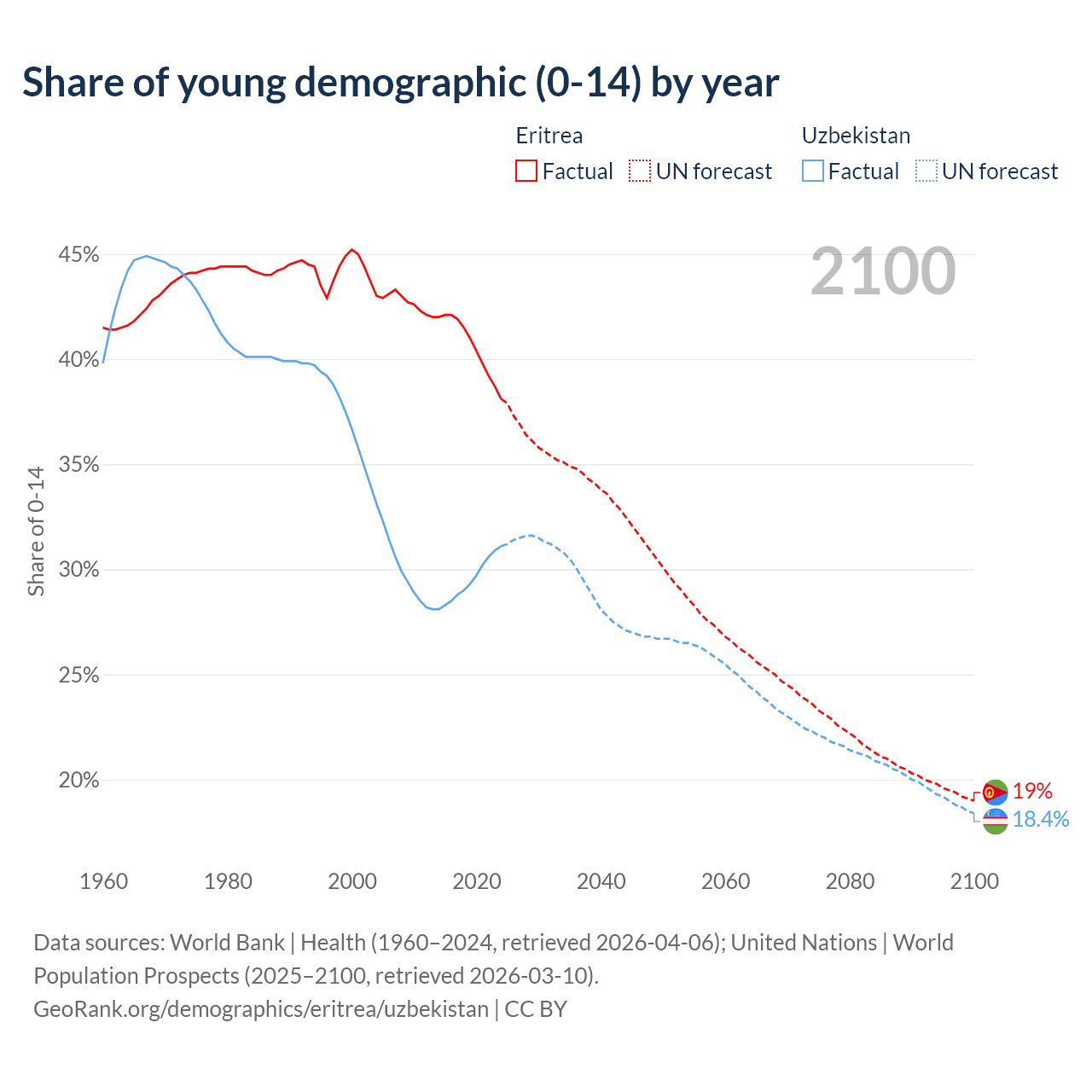 - The share of young demographic (0-15 years old) in Eritrea is 38.1% vs 31.1% in Uzbekistan.