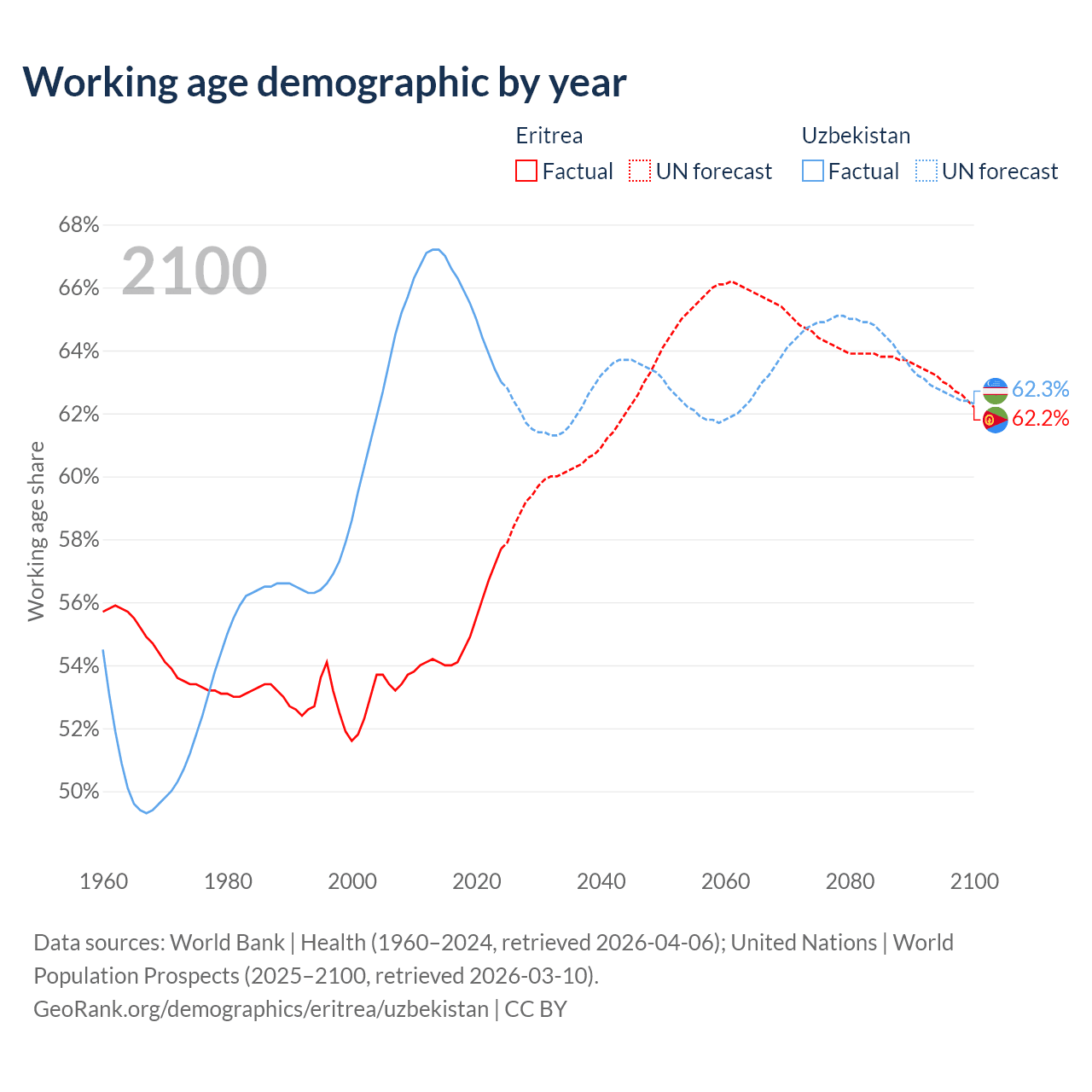 - Eritrea has 2.13M working age adults (aged 15-64) vs 23.9M in Uzbekistan.