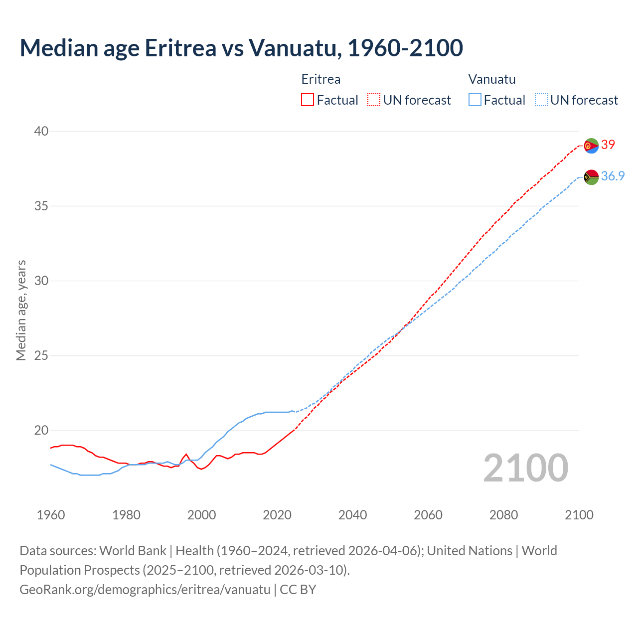 Median age Eritrea vs Vanuatu, 1960-2100
