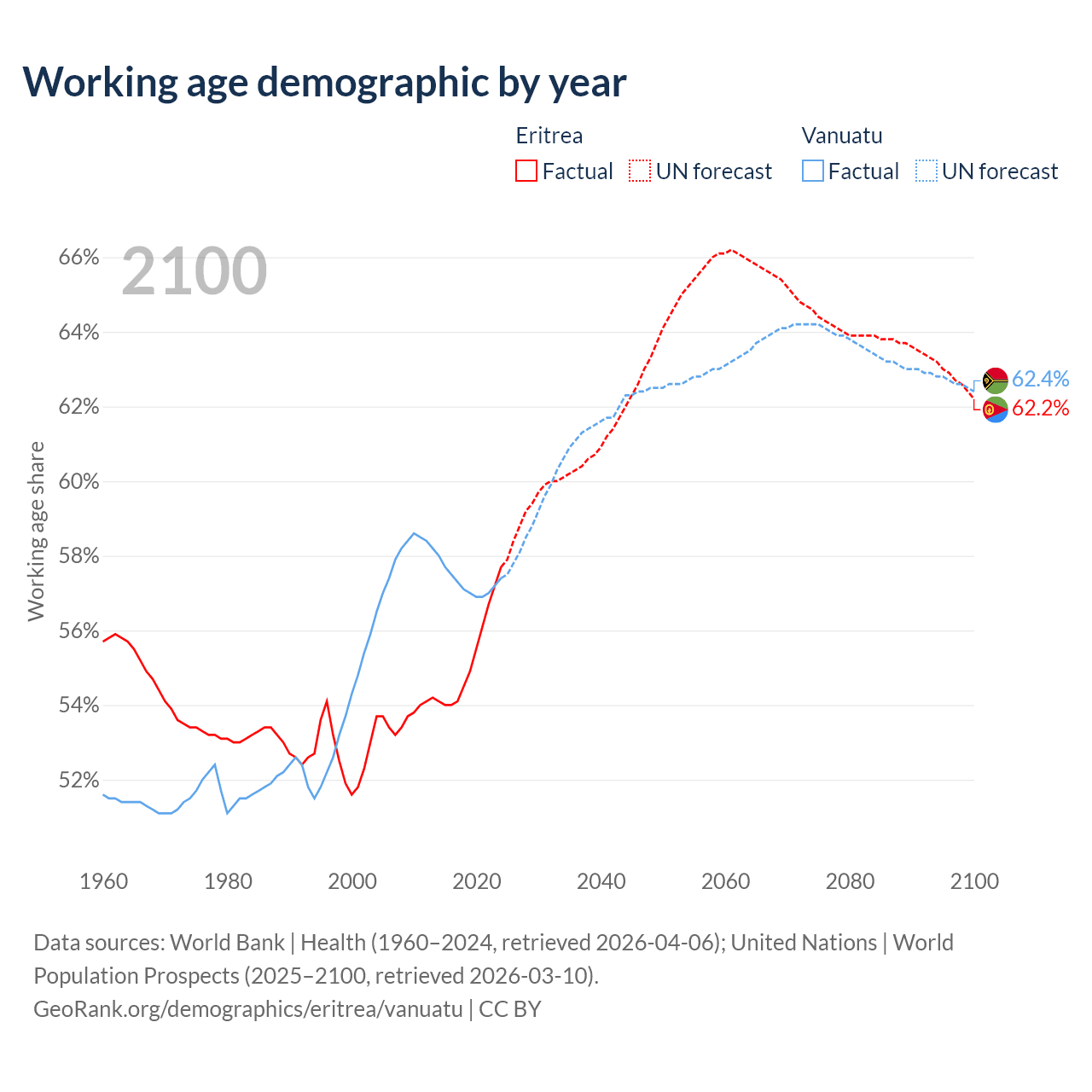 The share of older people aged 65 and over is 4.2% in Eritrea and 4.3% in Vanuatu. Life expectancy in Eritrea compared to Vanuatu .