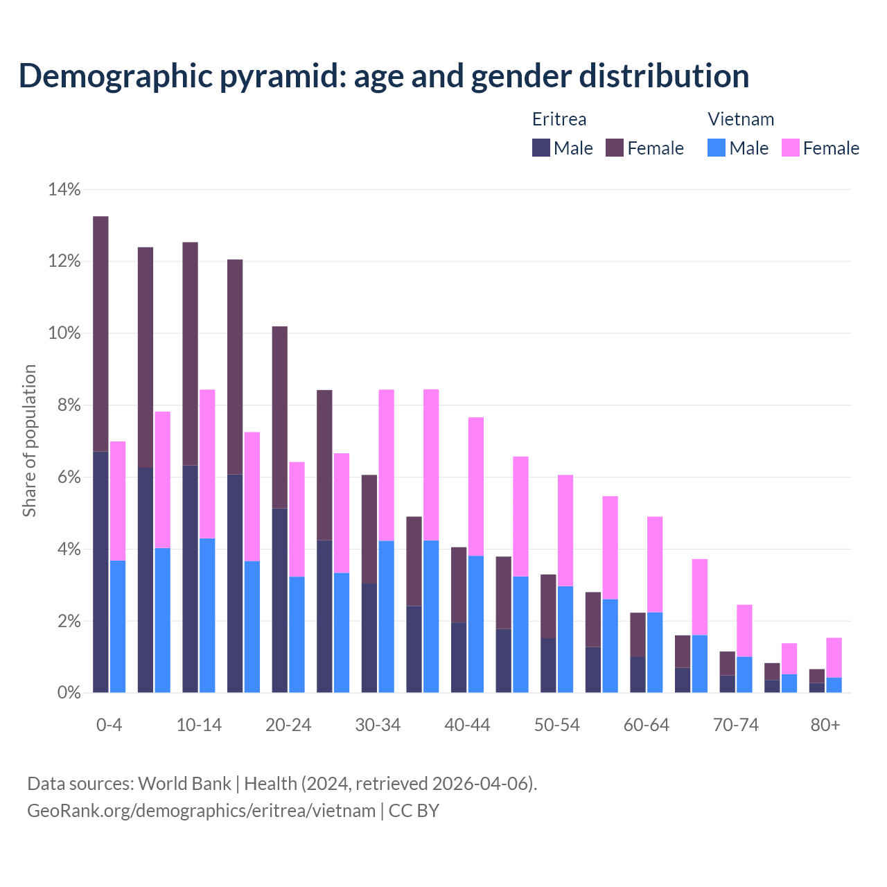 - Eritrea is ranked 168/196 by median age (oldest to youngest) vs 84/196 for Vietnam.
