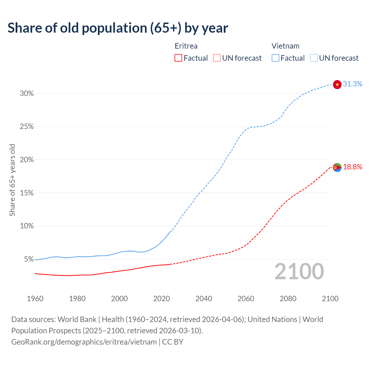 The share of older people aged 65 and over is 4.2% in Eritrea and 9.05% in Vietnam. Life expectancy in Eritrea compared to Vietnam .