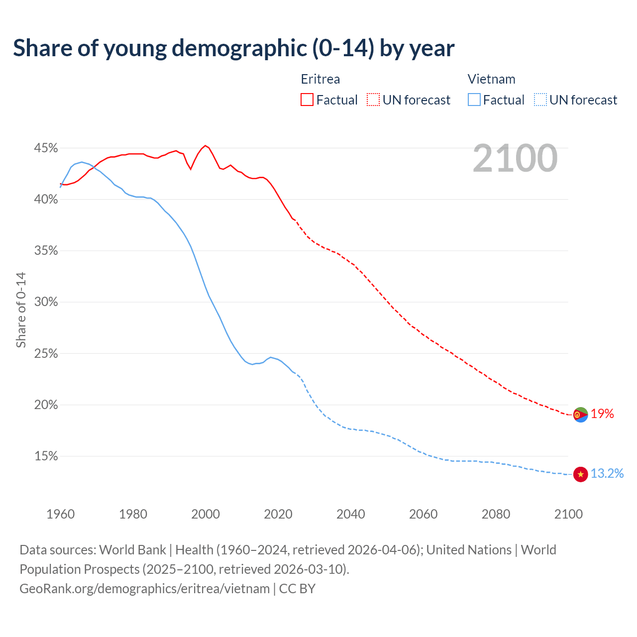- The share of young demographic (0-15 years old) in Eritrea is 38.1% vs 23.2% in Vietnam.