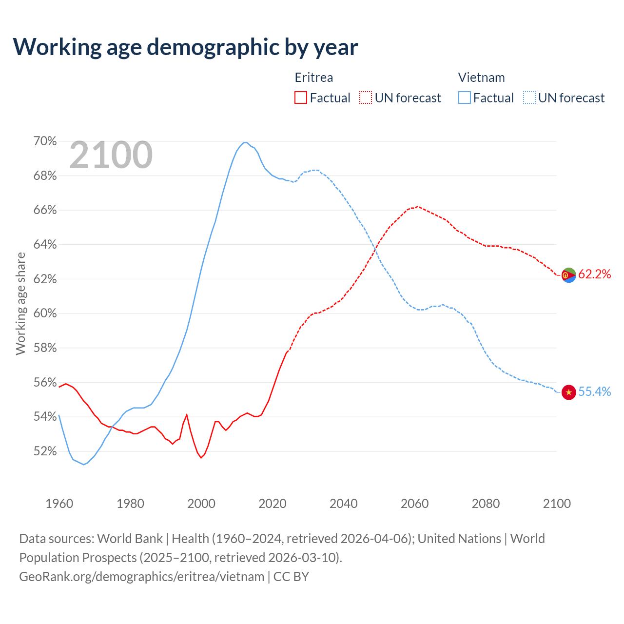 - Eritrea has 2.13M working age adults (aged 15-64) vs 69.3M in Vietnam.