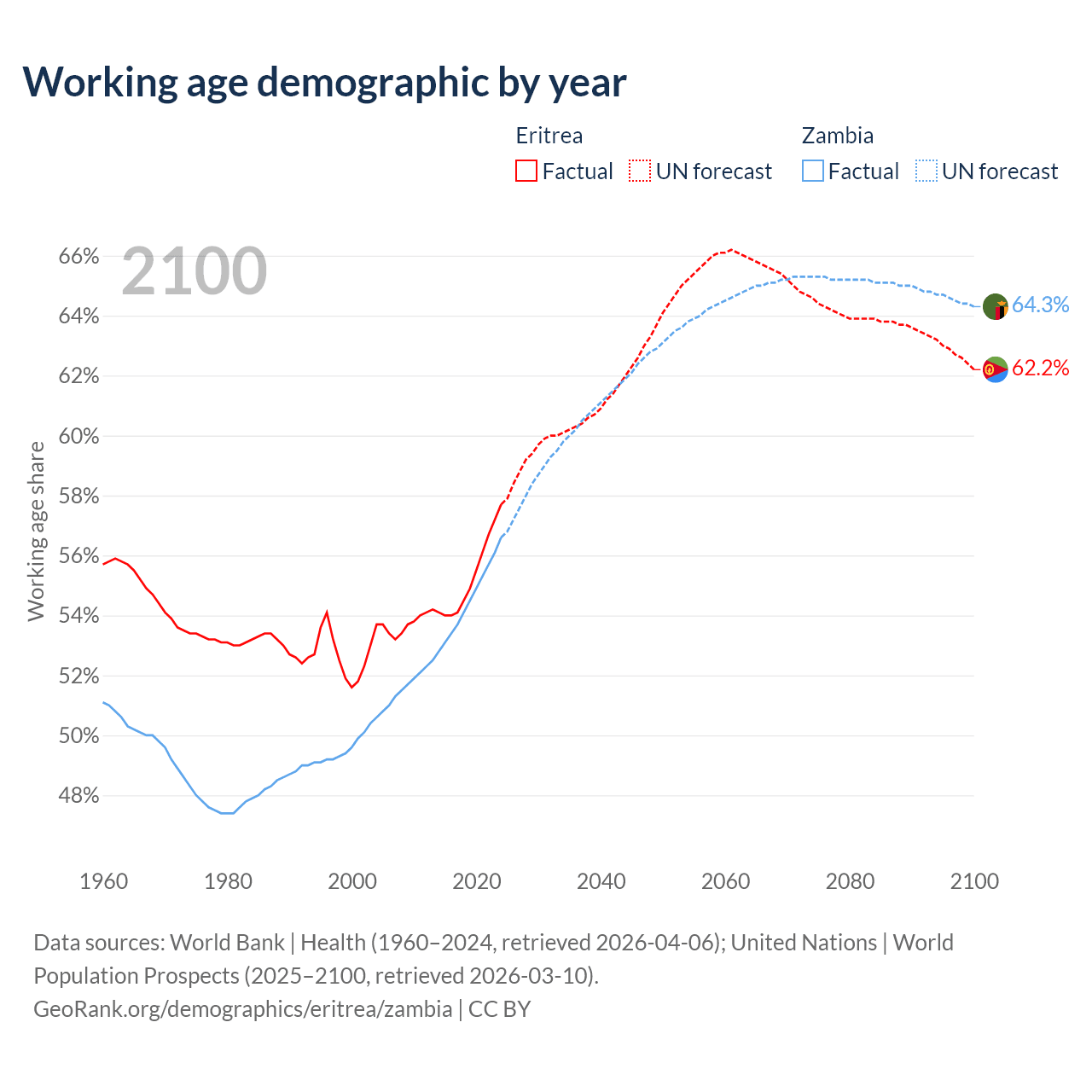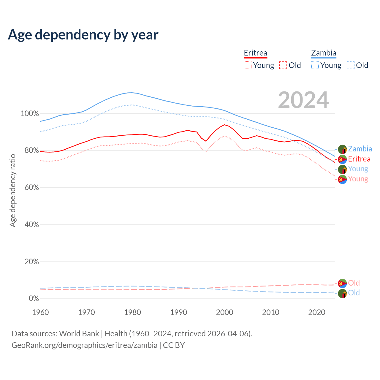 The share of older people aged 65 and over is 4.2% in Eritrea and 1.95% in Zambia. Life expectancy in Eritrea compared to Zambia .