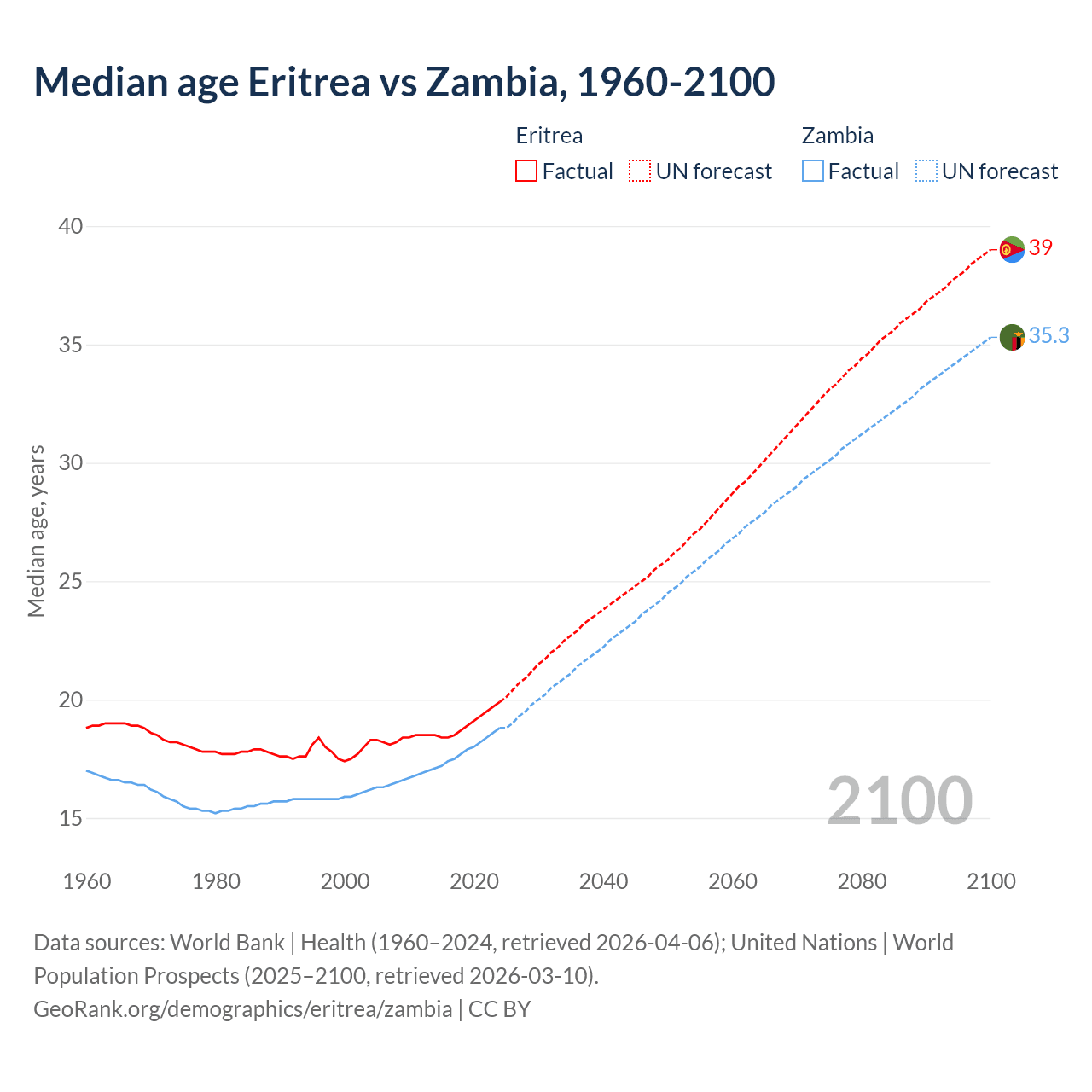 Median age Eritrea vs Zambia, 1960-2100