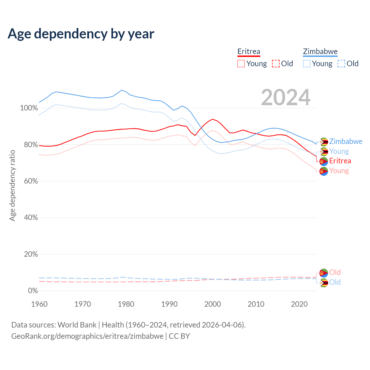- Eritrea is ranked 168/196 by median age (oldest to youngest) vs 177/196 for Zimbabwe.