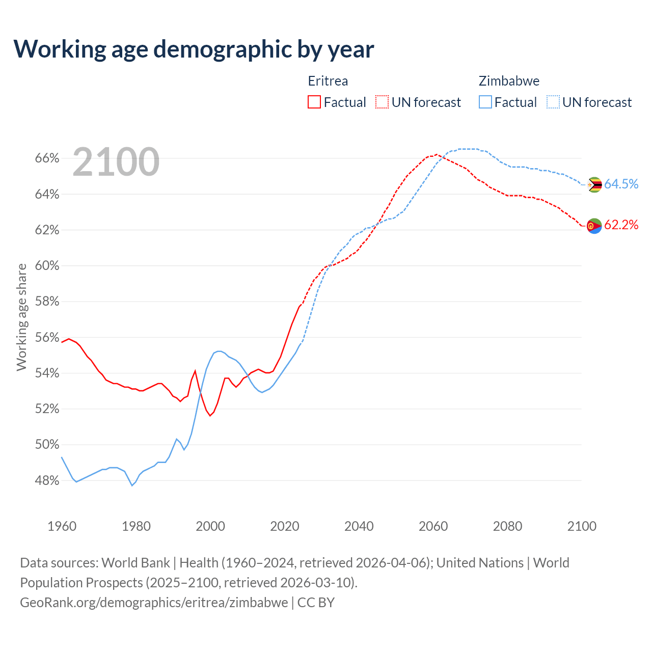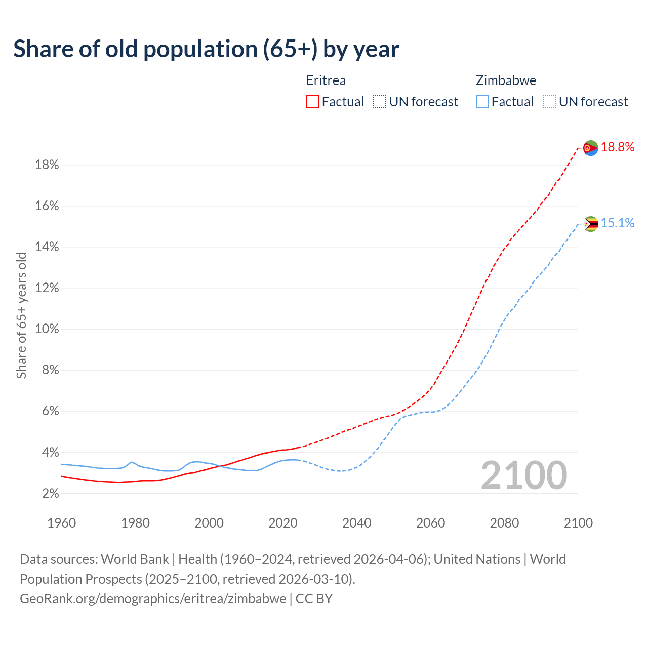 The share of older people aged 65 and over is 4.2% in Eritrea and 3.6% in Zimbabwe. Life expectancy in Eritrea compared to Zimbabwe .
