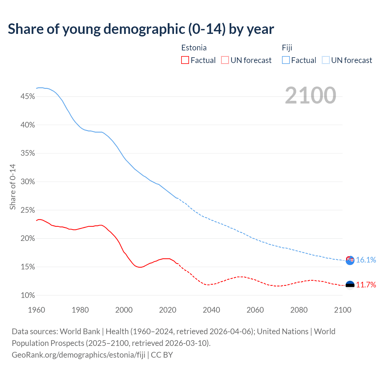 - The share of young demographic (0-15 years old) in Estonia is 15.6% vs 27.1% in Fiji.