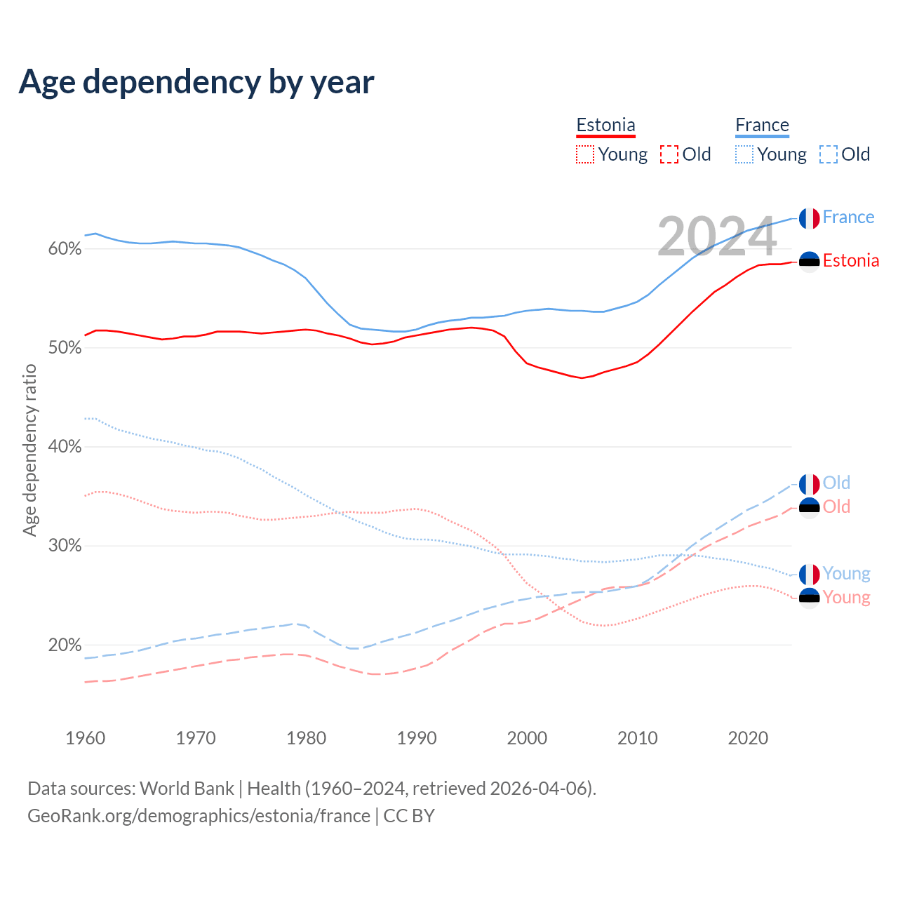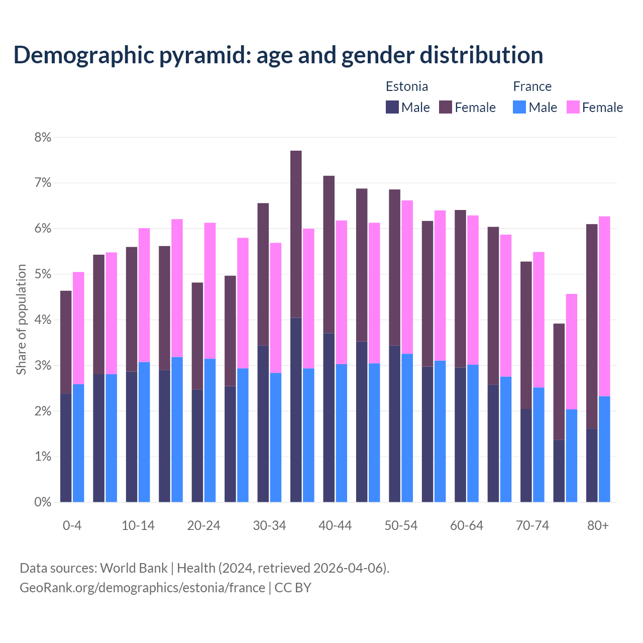 - Estonia is ranked 25/196 by median age (oldest to youngest) vs 29/196 for France.