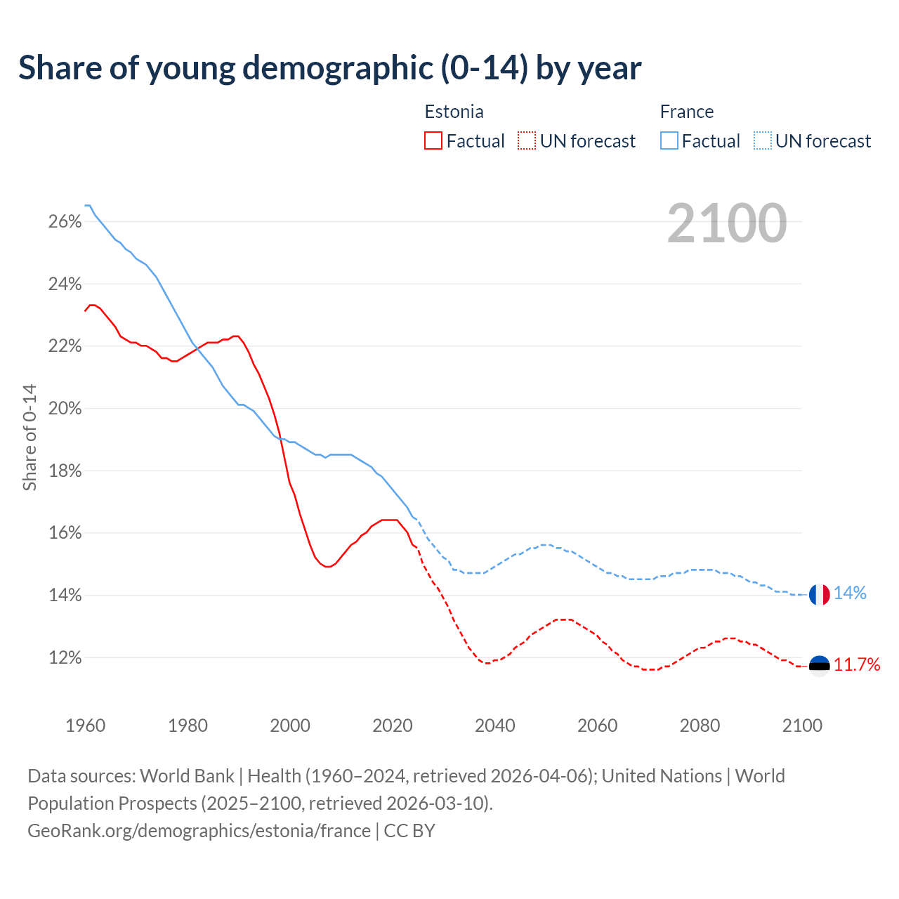 - The share of young demographic (0-15 years old) in Estonia is 15.6% vs 16.5% in France.