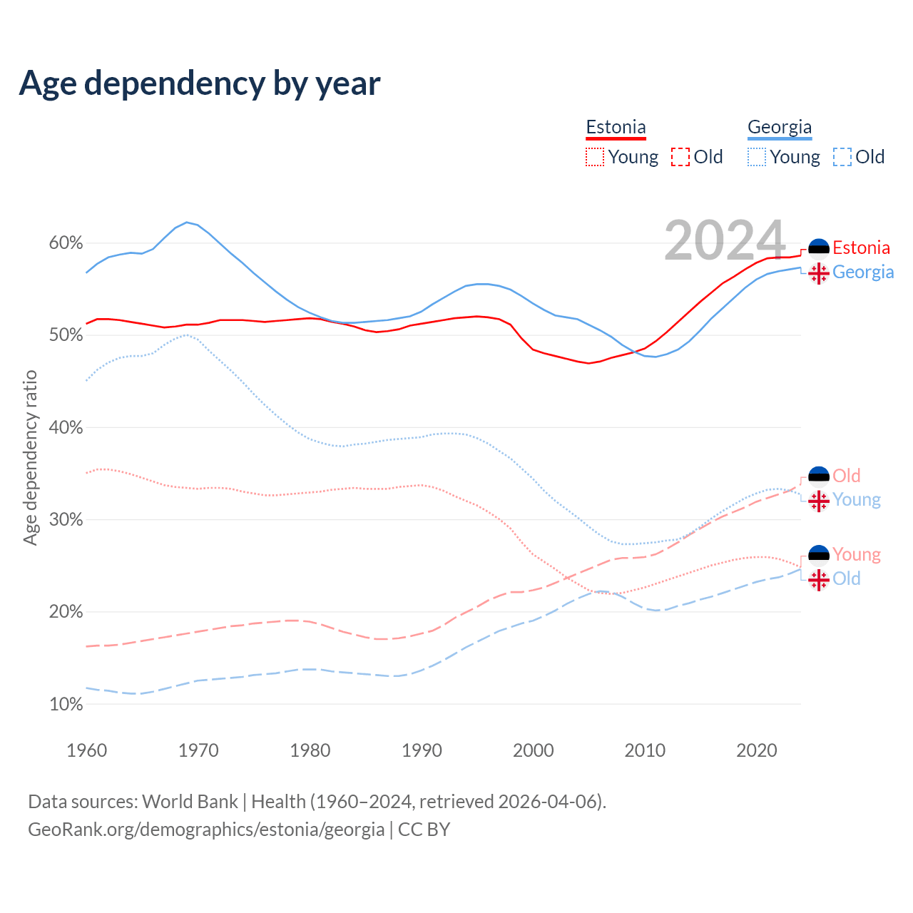 Data sources: World Bank | Health (1960–2024, retrieved 2026-04-06); U.S. Census Bureau (1960–2024, retrieved 2026-02-08).