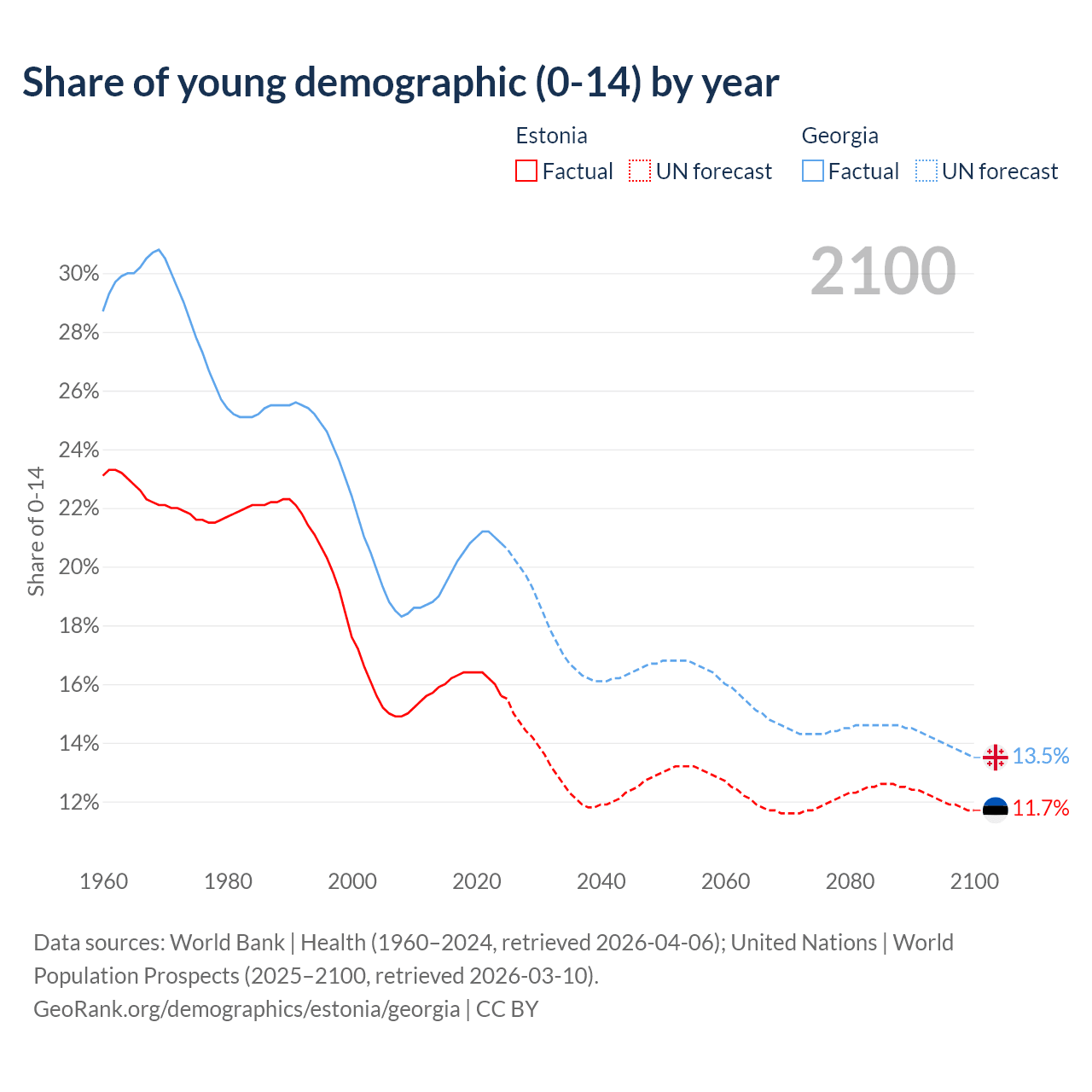 - The share of young demographic (0-15 years old) in Estonia is 15.6% vs 20.8% in Georgia.