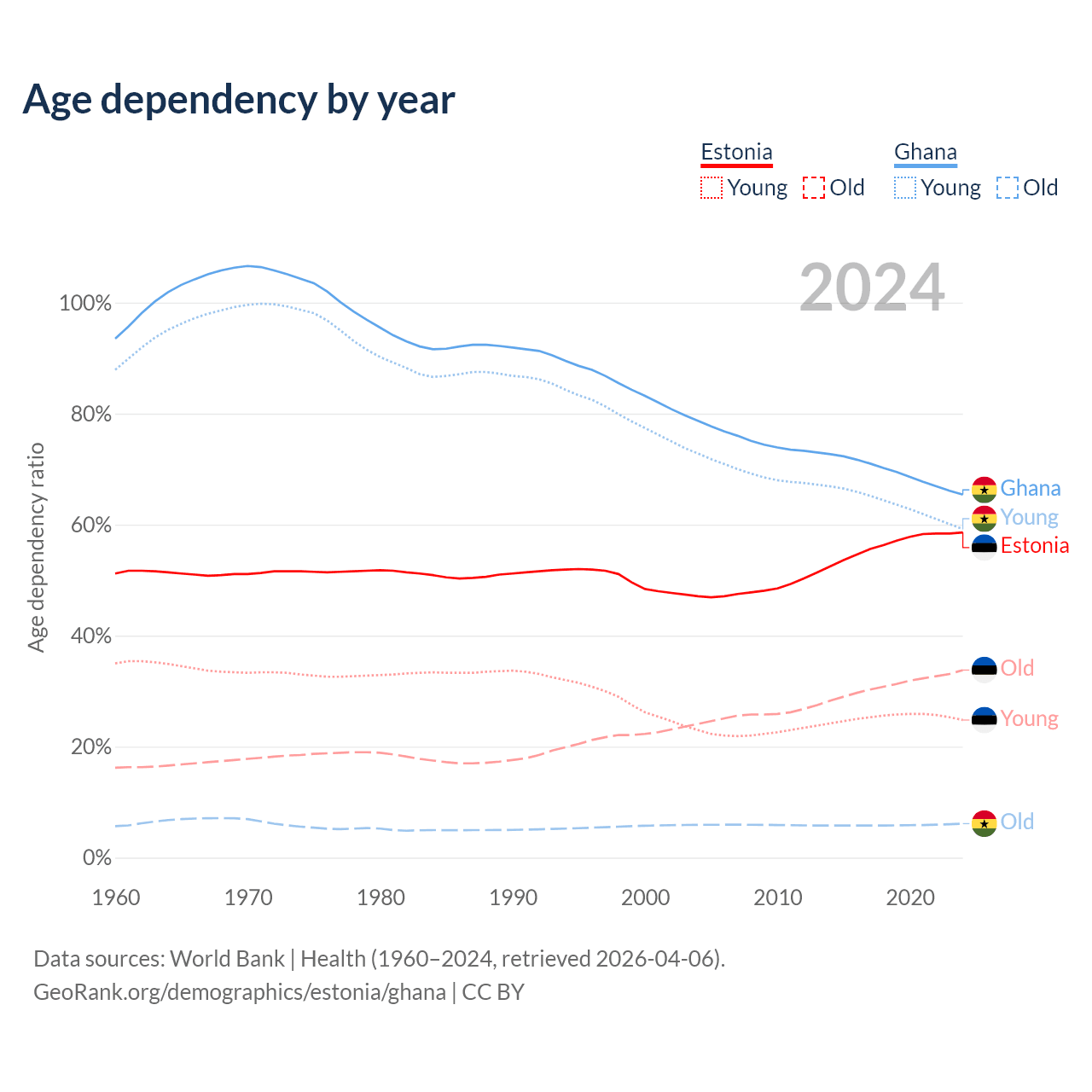 - The share of old-age demographic (65+) in Estonia is 21.3% vs 3.71% in Ghana.