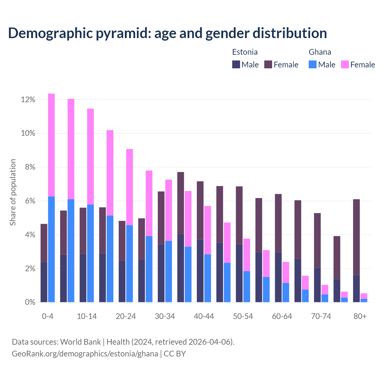 - As of 2026, the population of Estonia is 1.34M vs 35.9M in Ghana - 26.8 times difference.