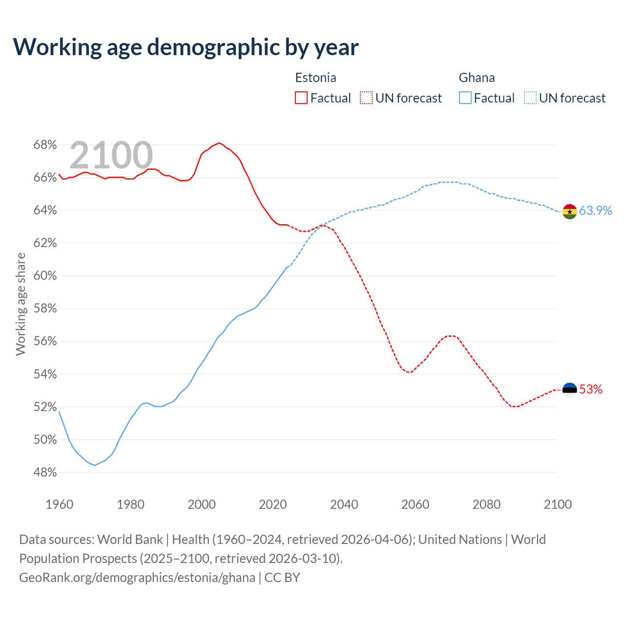 - Estonia has 845K working age adults (aged 15-64) vs 21.7M in Ghana.