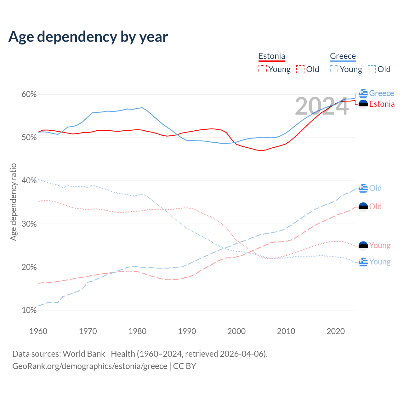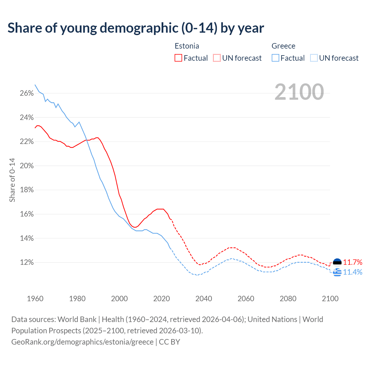 - The share of young demographic (0-15 years old) in Estonia is 15.6% vs 13.2% in Greece.