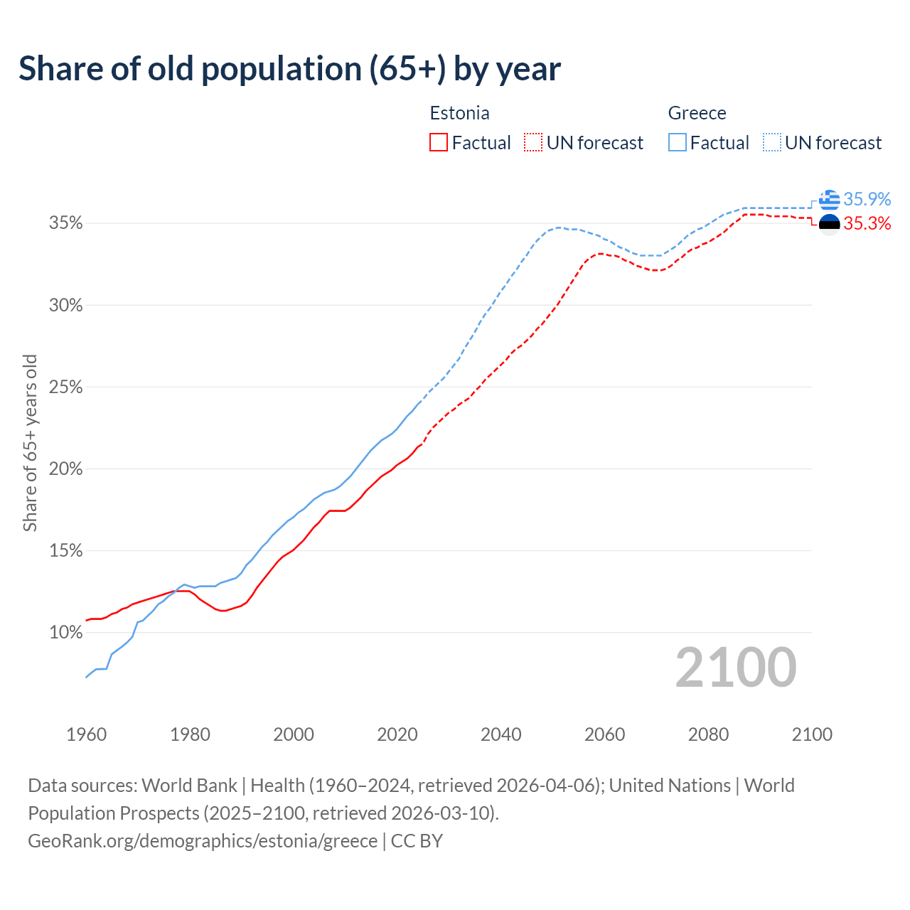 The share of older people aged 65 and over is 21.3% in Estonia and 23.9% in Greece. Life expectancy in Estonia compared to Greece .