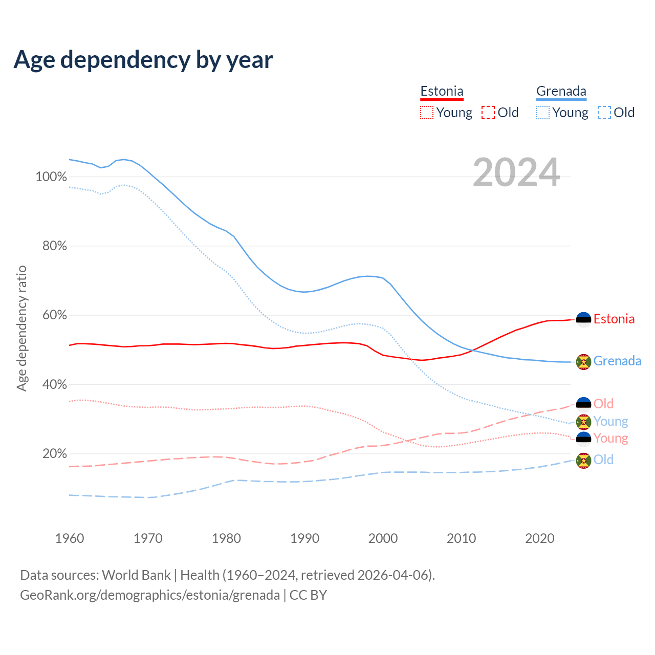 Data sources: World Bank | Health (1960–2024, retrieved 2026-04-06); U.S. Census Bureau (1960–2024, retrieved 2026-02-08).