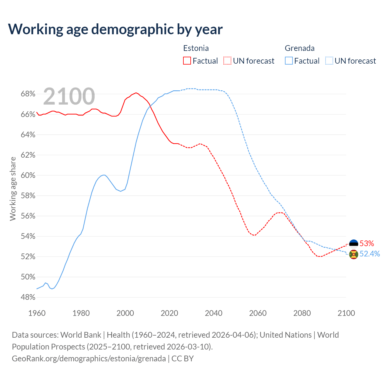 Median age Estonia vs Grenada, 1960-2100