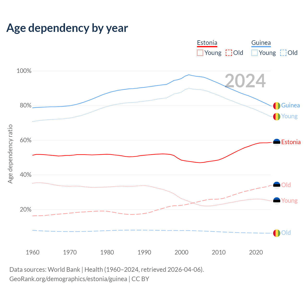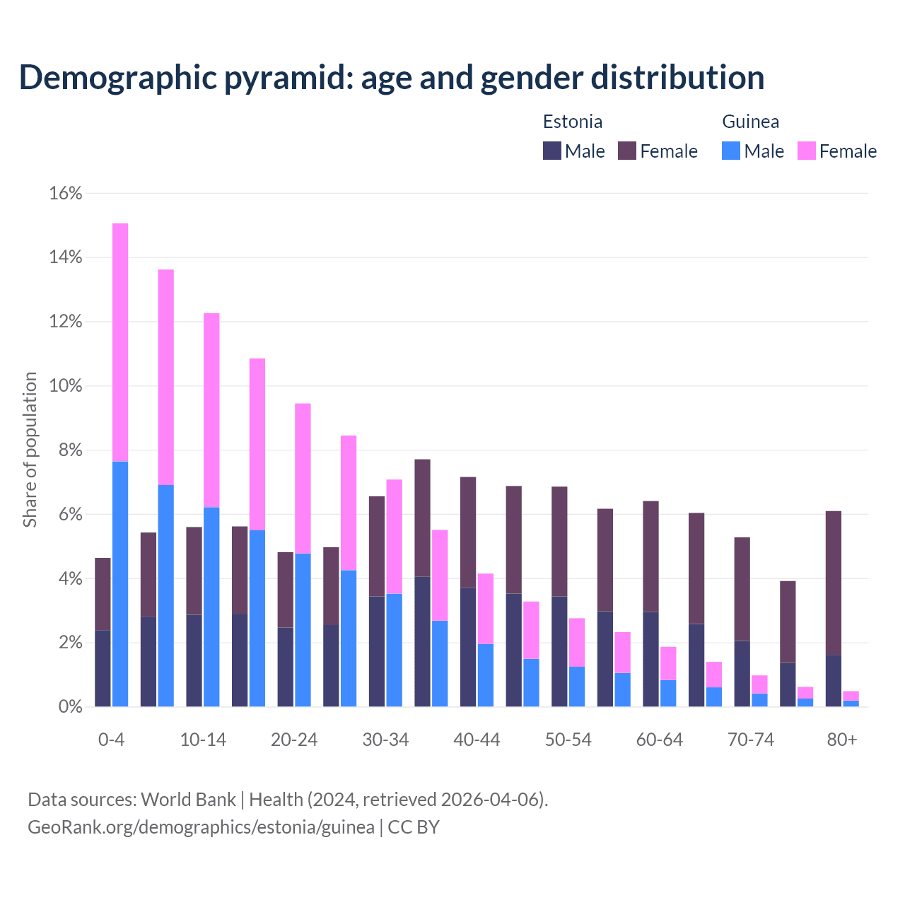 - Estonia is ranked 25/196 by median age (oldest to youngest) vs 176/196 for Guinea.