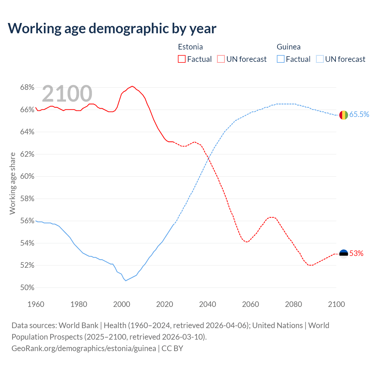 - Estonia has 845K working age adults (aged 15-64) vs 8.65M in Guinea.