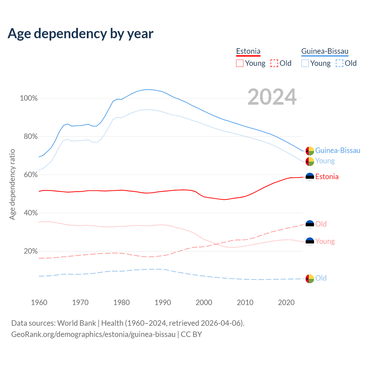 Data sources: World Bank | Health (1960–2024, retrieved 2026-04-06); U.S. Census Bureau (1960–2024, retrieved 2026-02-08).