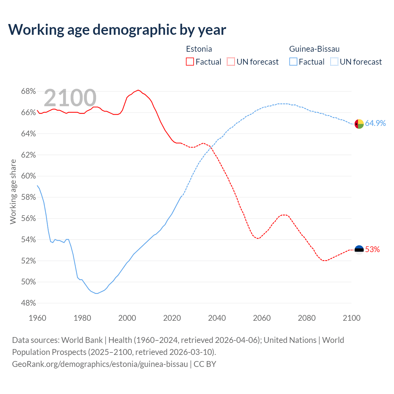 - Estonia has 845K working age adults (aged 15-64) vs 1.34M in Guinea-Bissau.