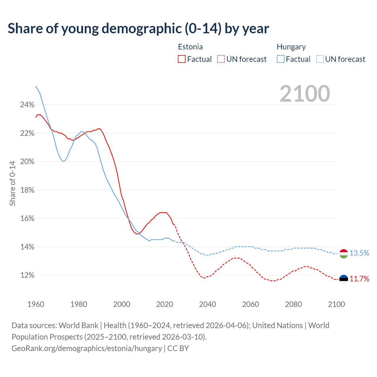 Median age Estonia vs Hungary, 1960-2100