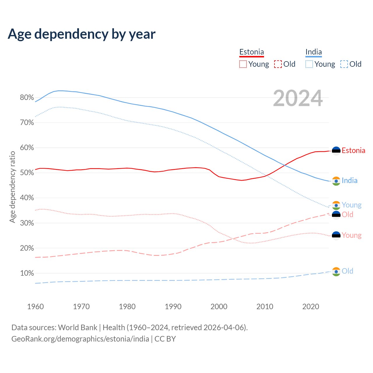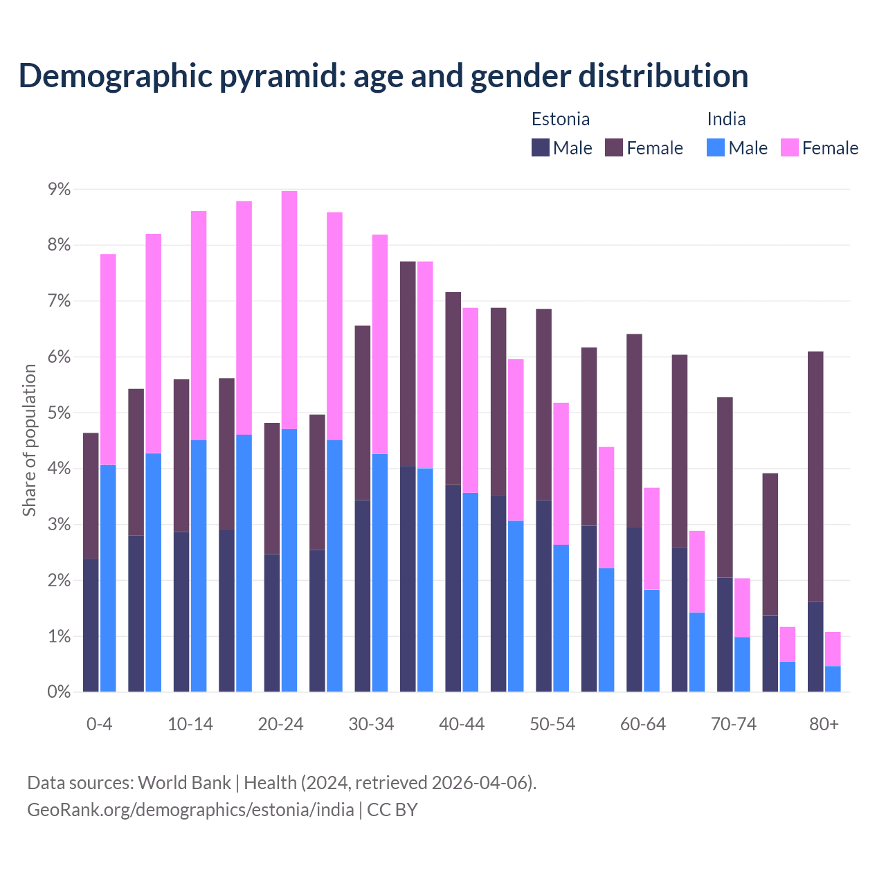 - Estonia is ranked 25/196 by median age (oldest to youngest) vs 108/196 for India.