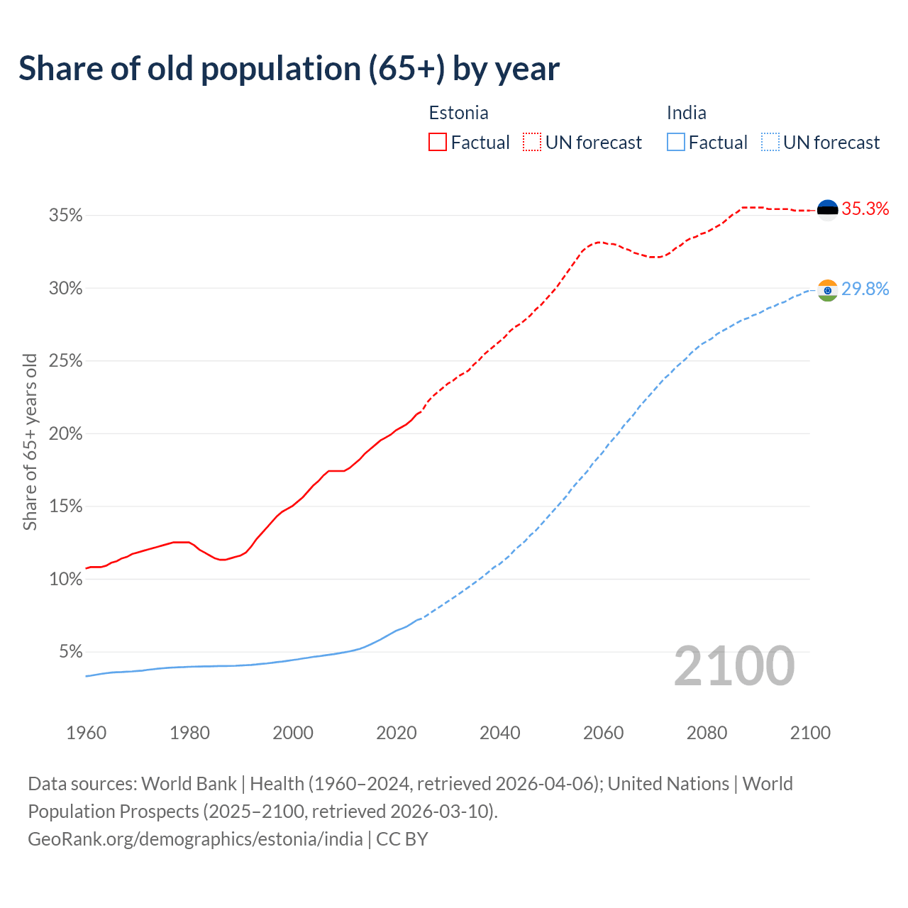 The share of older people aged 65 and over is 21.3% in Estonia and 7.15% in India. Life expectancy in Estonia compared to India .