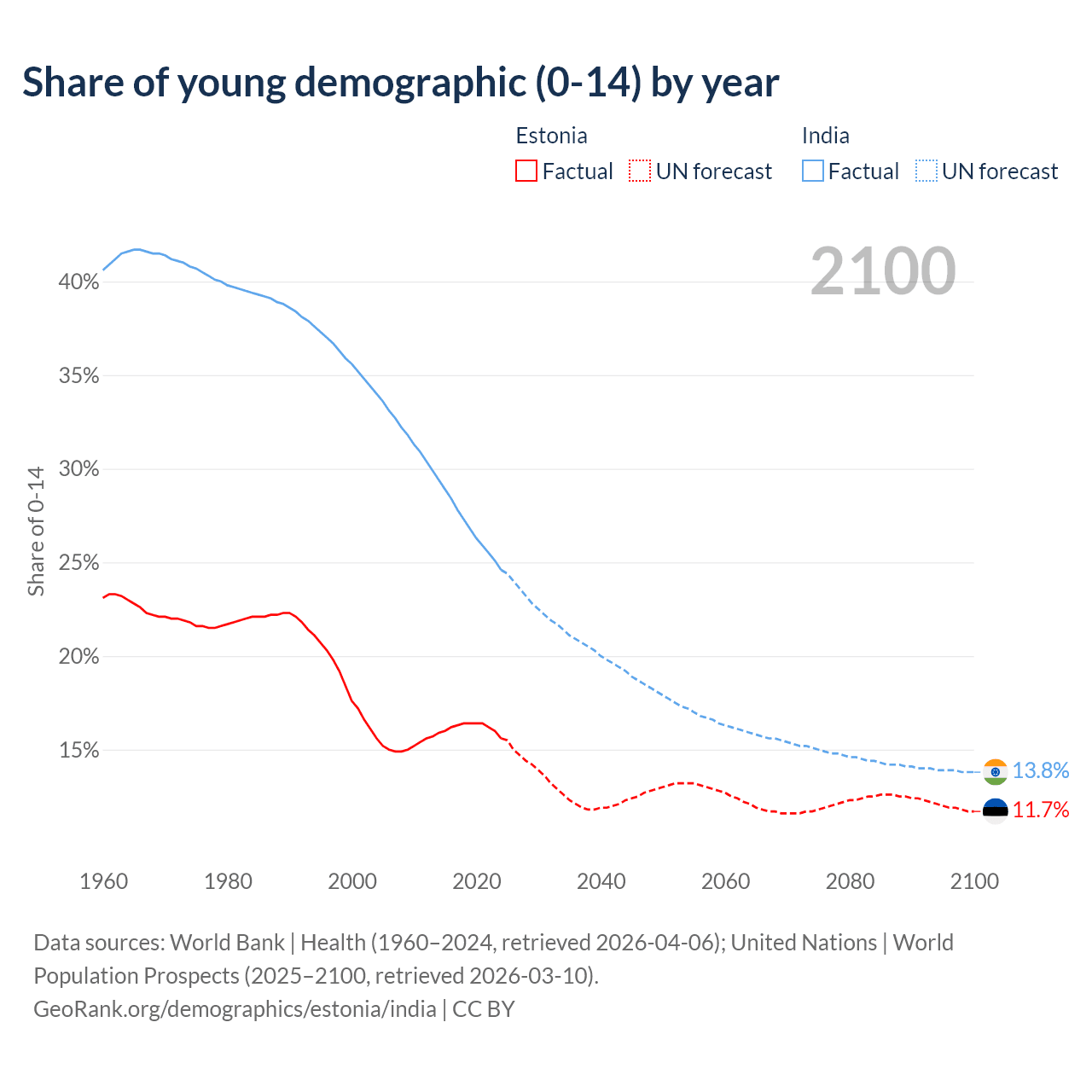 - The share of young demographic (0-15 years old) in Estonia is 15.6% vs 24.6% in India.