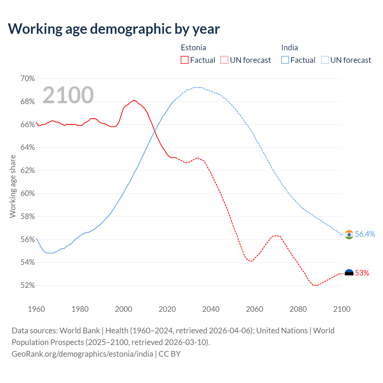 - Estonia has 845K working age adults (aged 15-64) vs 1.01B in India.