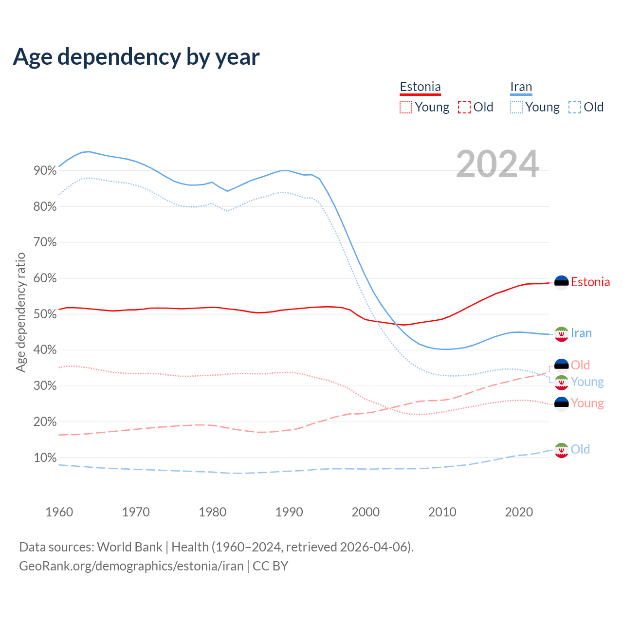 - The share of old-age demographic (65+) in Estonia is 21.3% vs 8.24% in Iran.