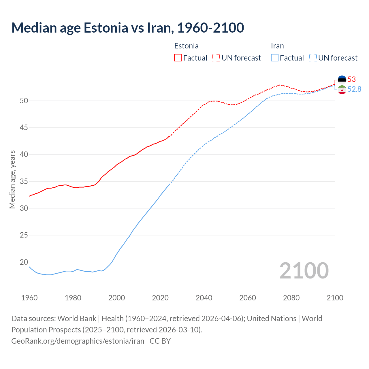 Median age Estonia vs Iran, 1960-2100
