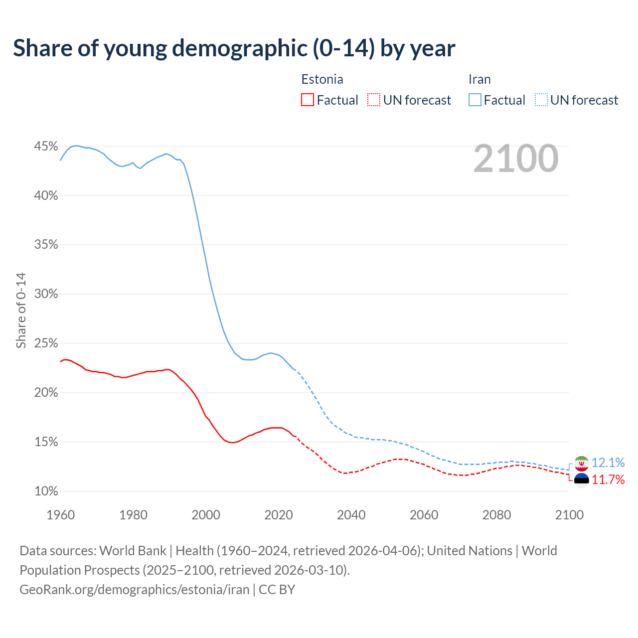 - The share of young demographic (0-15 years old) in Estonia is 15.6% vs 22.4% in Iran.