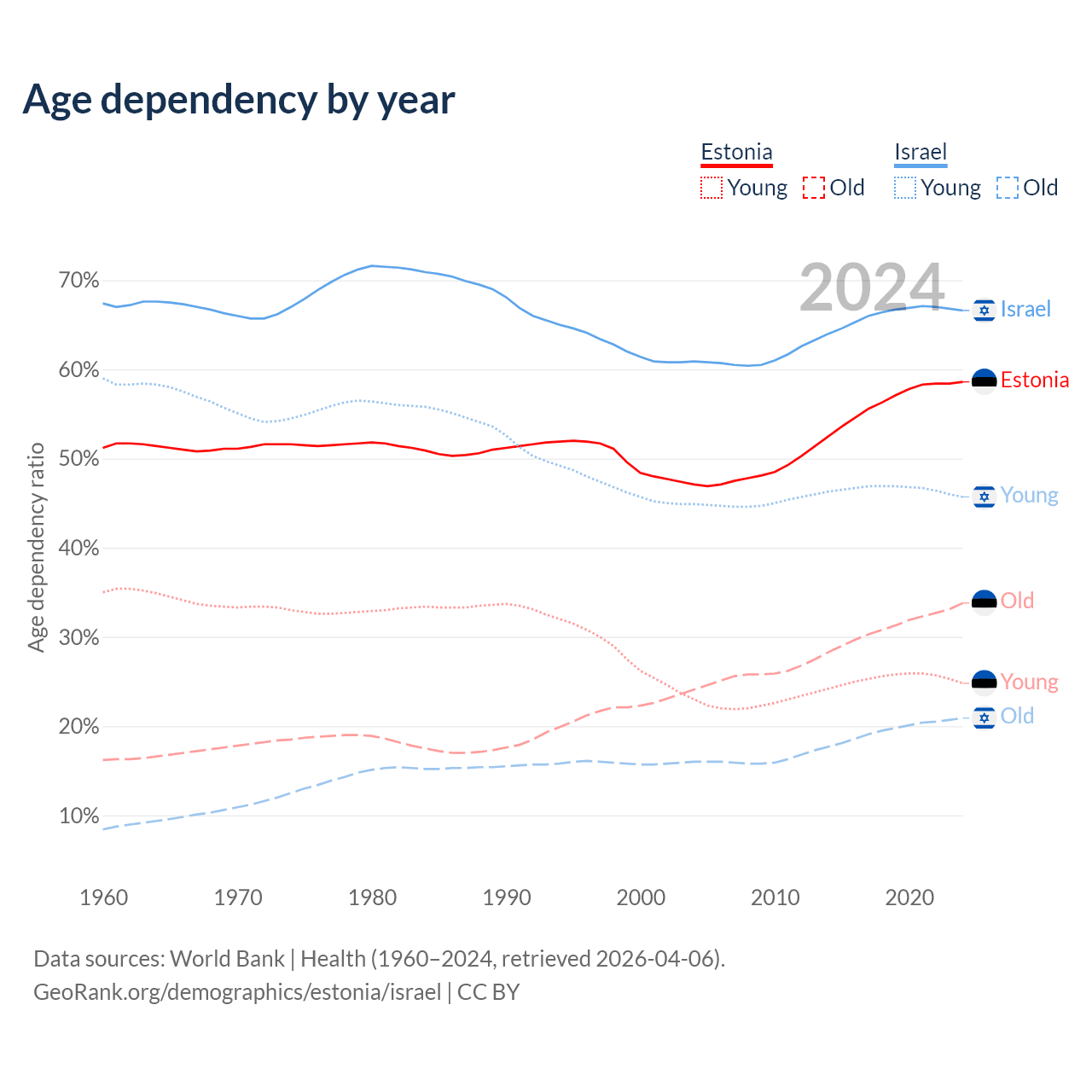 - Estonia is ranked 25/196 by median age (oldest to youngest) vs 103/196 for Israel.