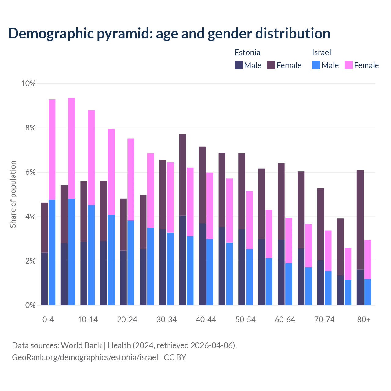 - As of 2026, the population of Estonia is 1.34M vs 10.3M in Israel - 7.68 times difference.