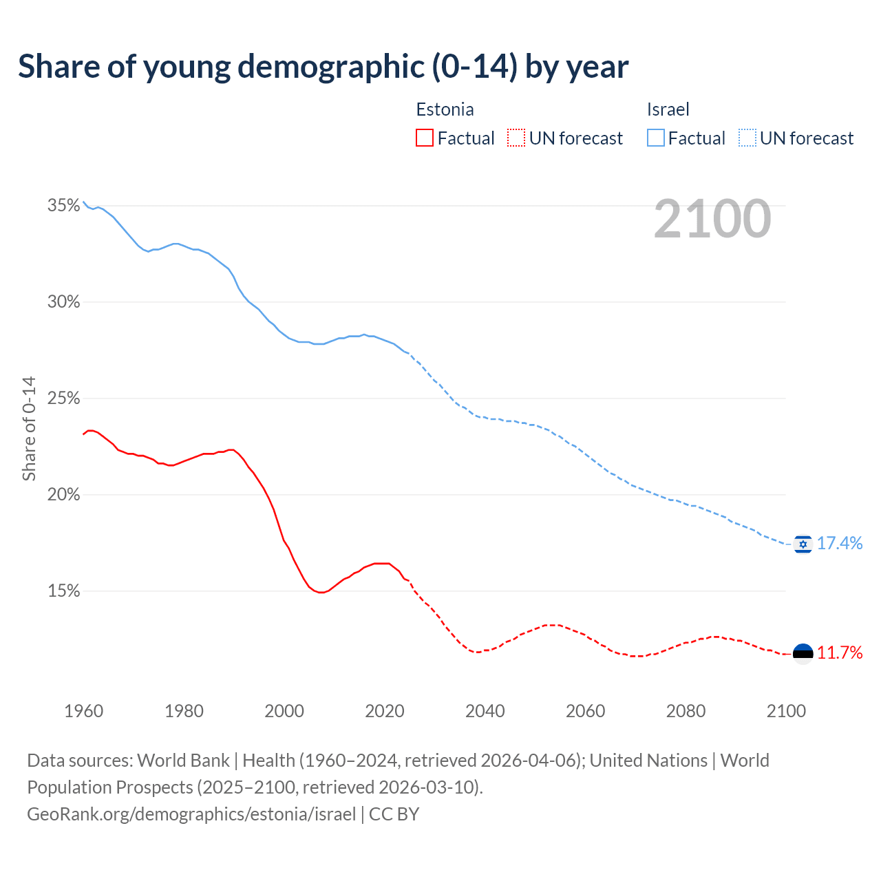 - The share of young demographic (0-15 years old) in Estonia is 15.6% vs 27.4% in Israel.
