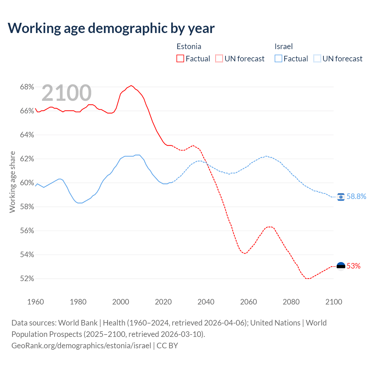 - Estonia has 845K working age adults (aged 15-64) vs 6.18M in Israel.