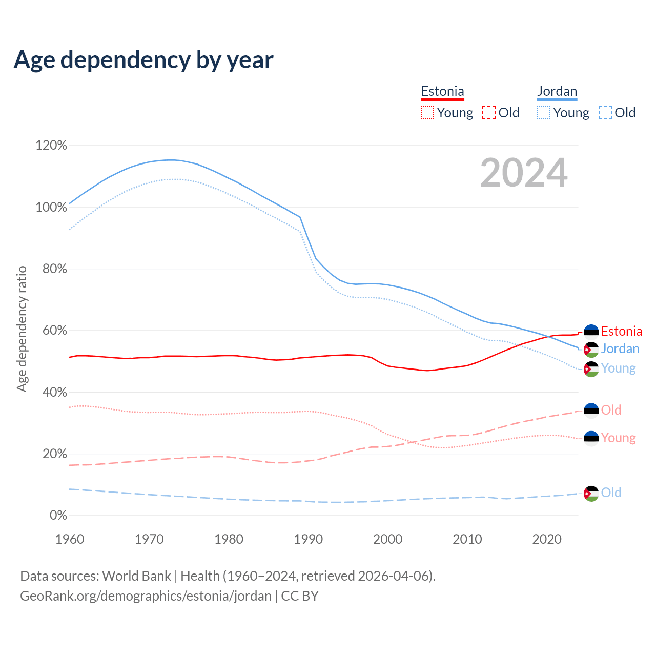 Data sources: World Bank | Health (1960–2024, retrieved 2026-04-06); U.S. Census Bureau (1960–2024, retrieved 2026-02-08).
