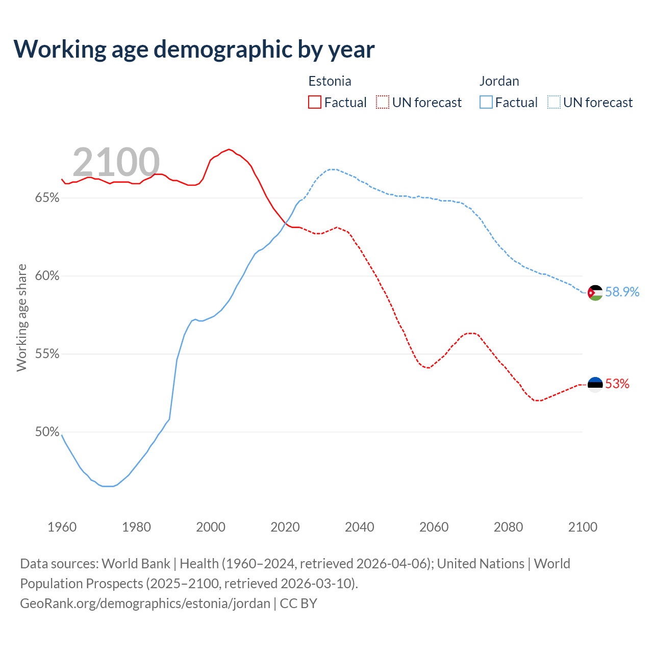 Median age Estonia vs Jordan, 1960-2100