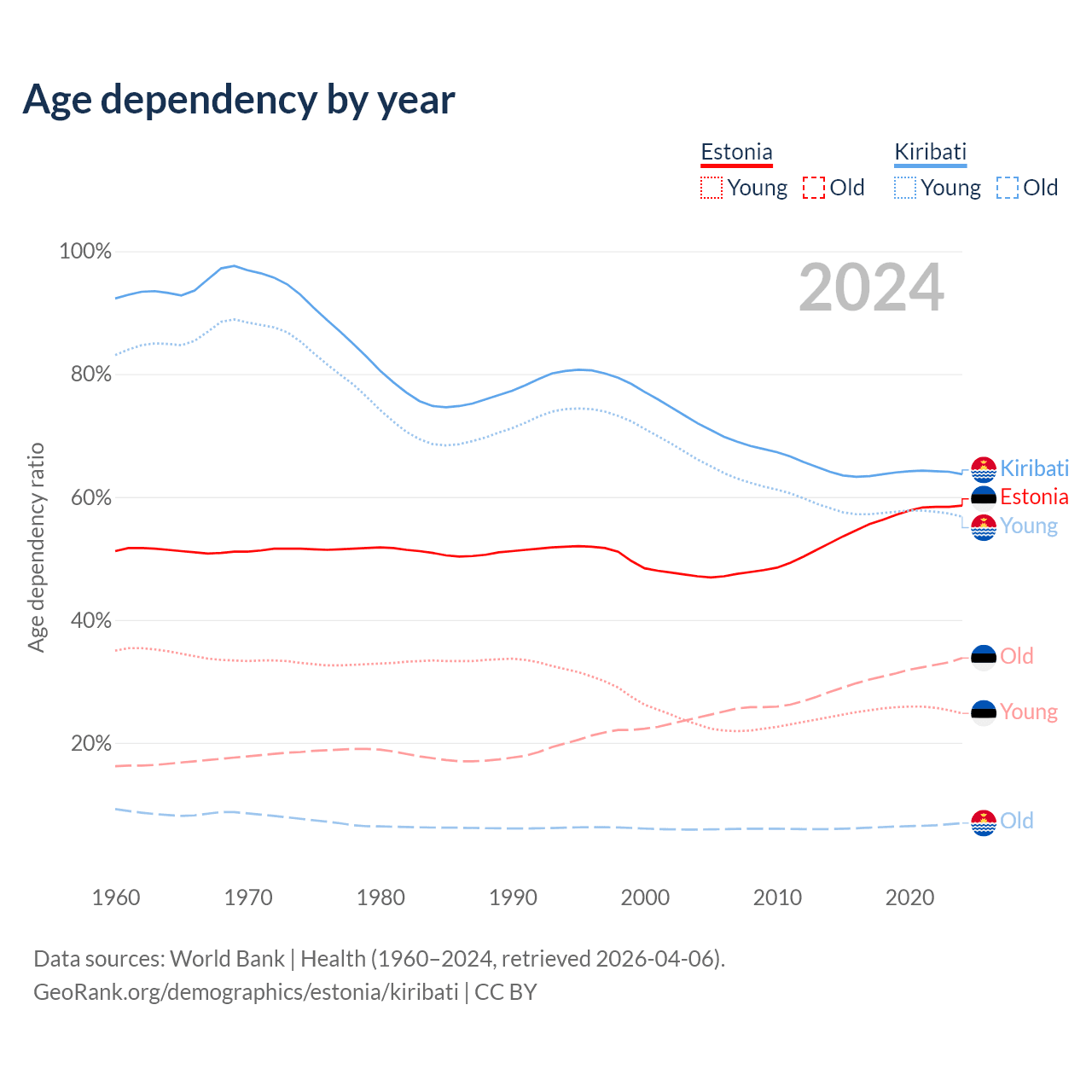 - The share of old-age demographic (65+) in Estonia is 21.3% vs 4.24% in Kiribati.