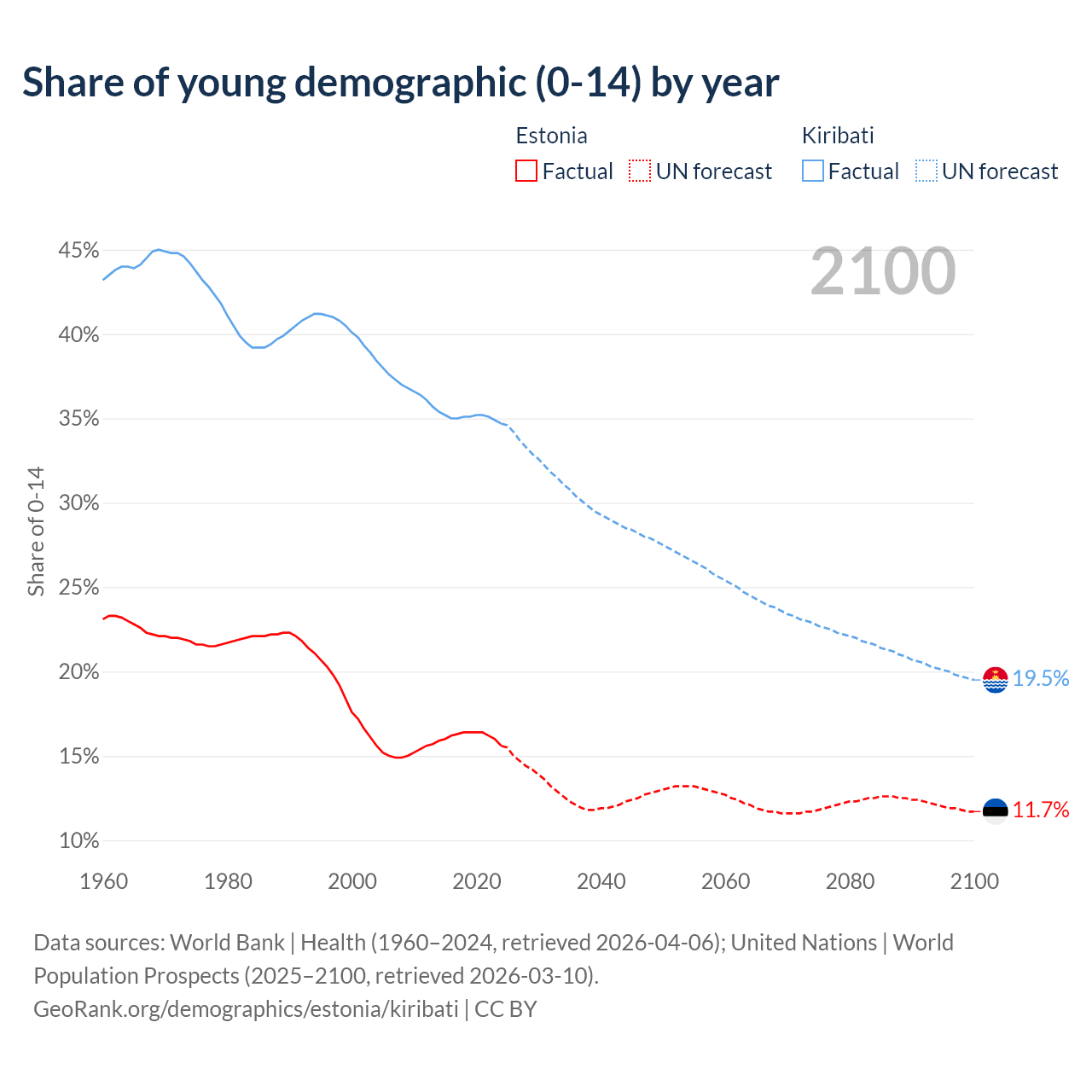 - The share of young demographic (0-15 years old) in Estonia is 15.6% vs 34.7% in Kiribati.