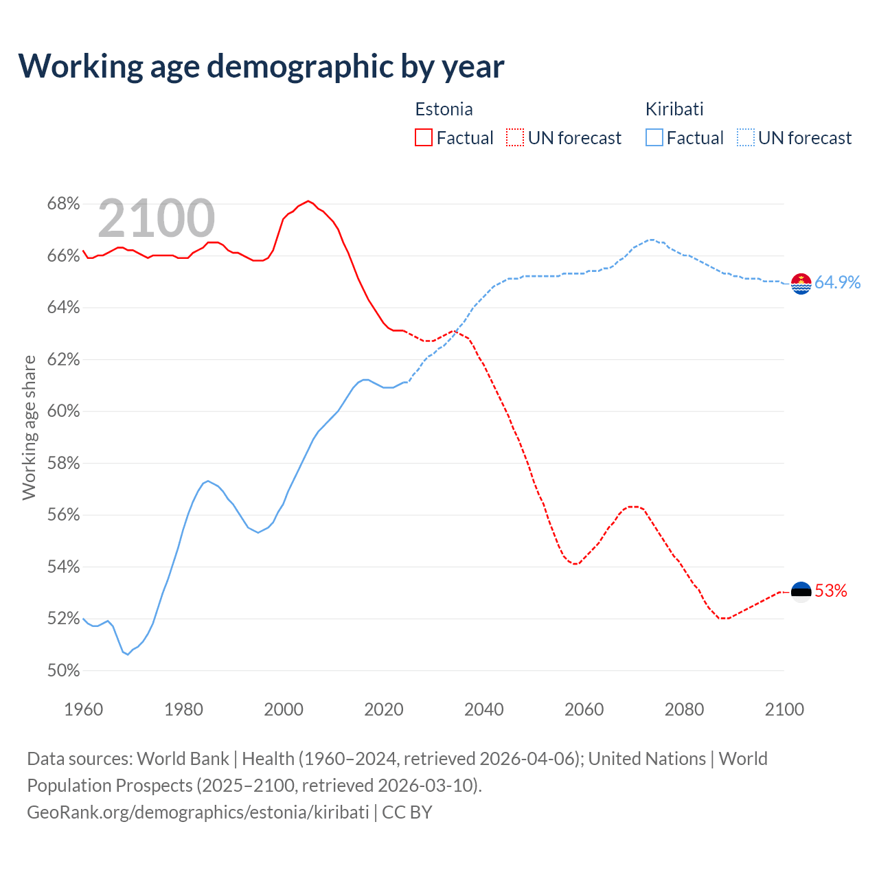 Median age Estonia vs Kiribati, 1960-2100