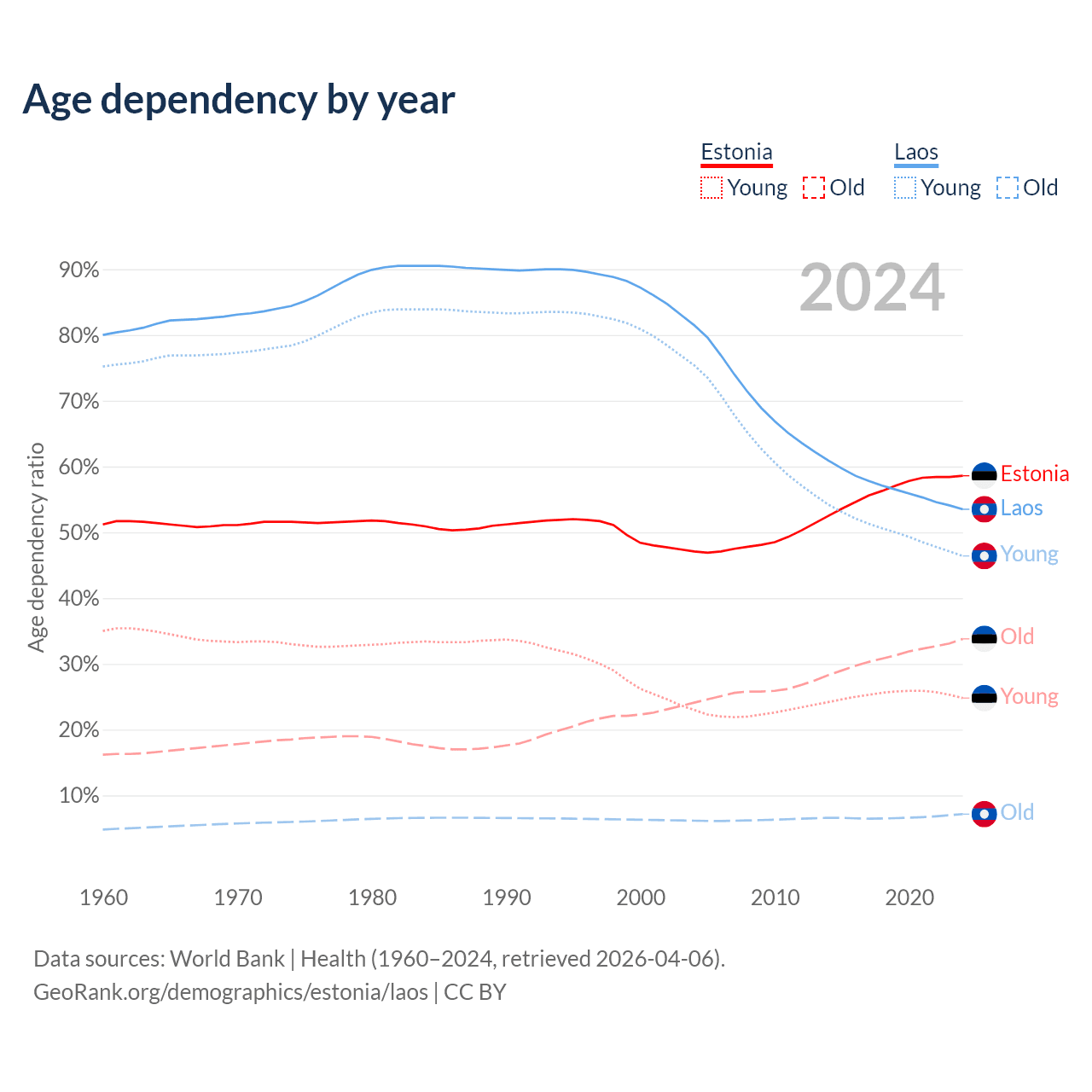 Data sources: World Bank | Health (1960–2024, retrieved 2026-04-06); U.S. Census Bureau (1960–2024, retrieved 2026-02-08).