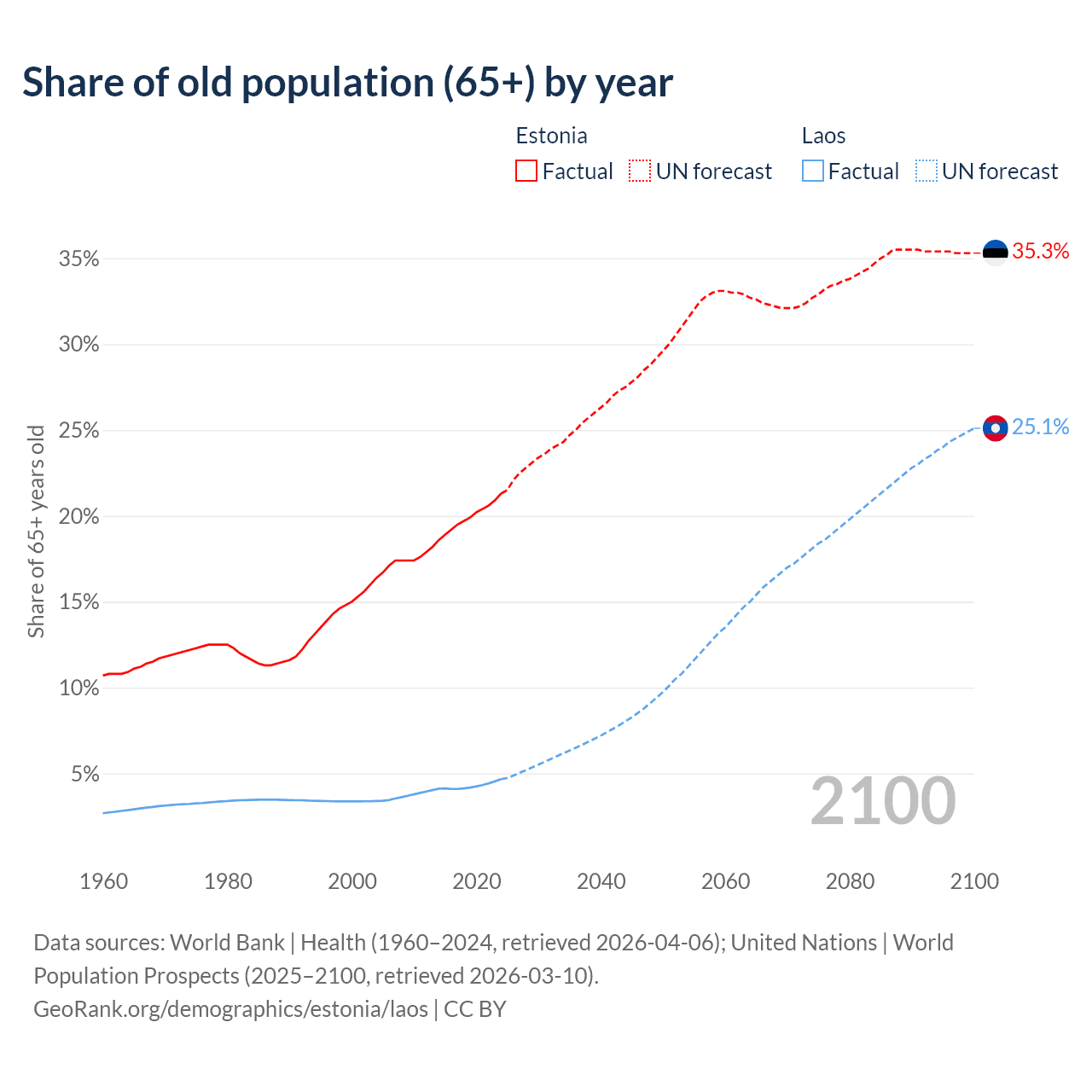 The share of older people aged 65 and over is 21.3% in Estonia and 4.67% in Laos. Life expectancy in Estonia compared to Laos .