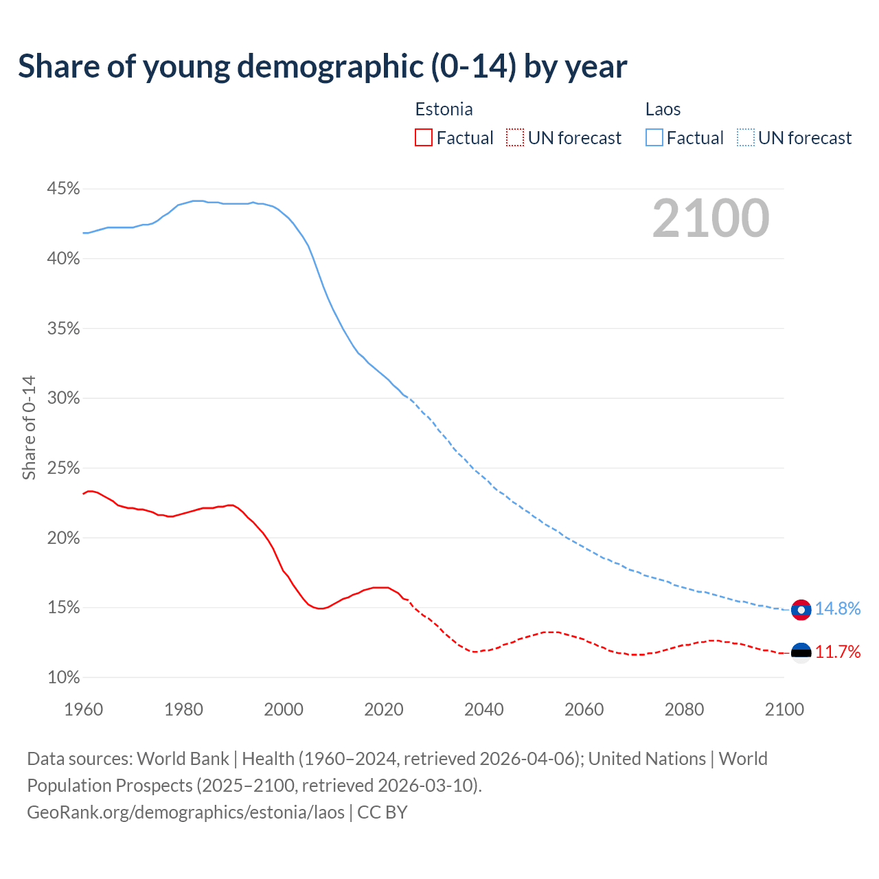 - The share of young demographic (0-15 years old) in Estonia is 15.6% vs 30.2% in Laos.