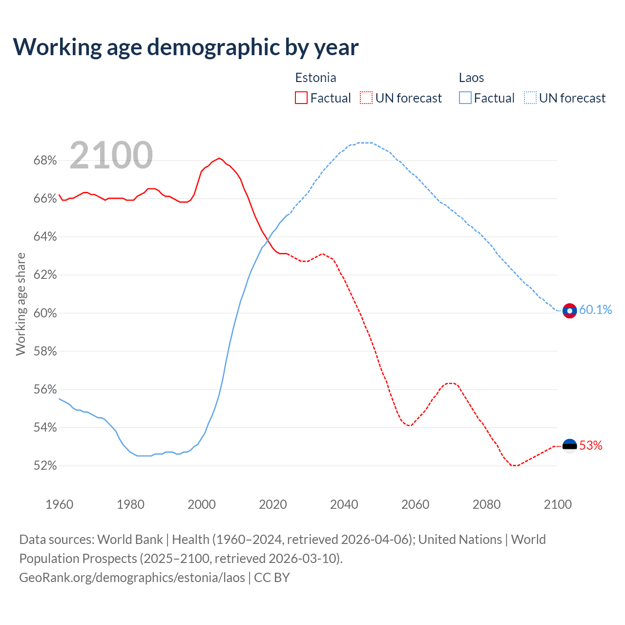 Median age Estonia vs Laos, 1960-2100